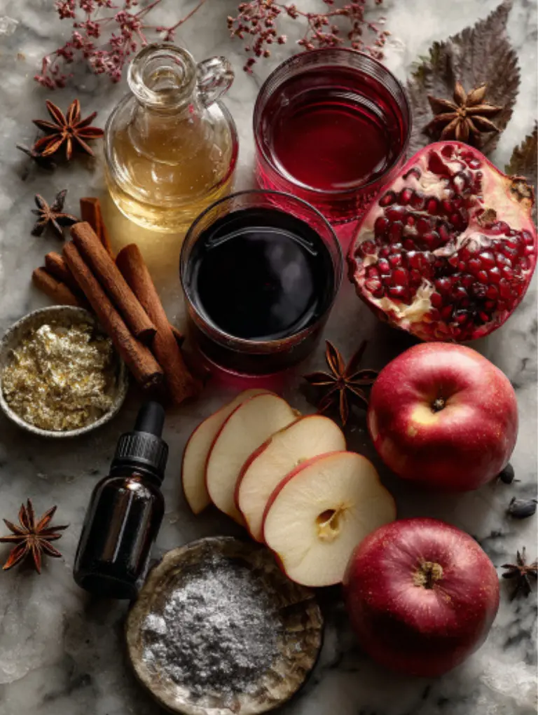 - Simple grocery list. Apple cider, pomegranate, a touch of shimmer.